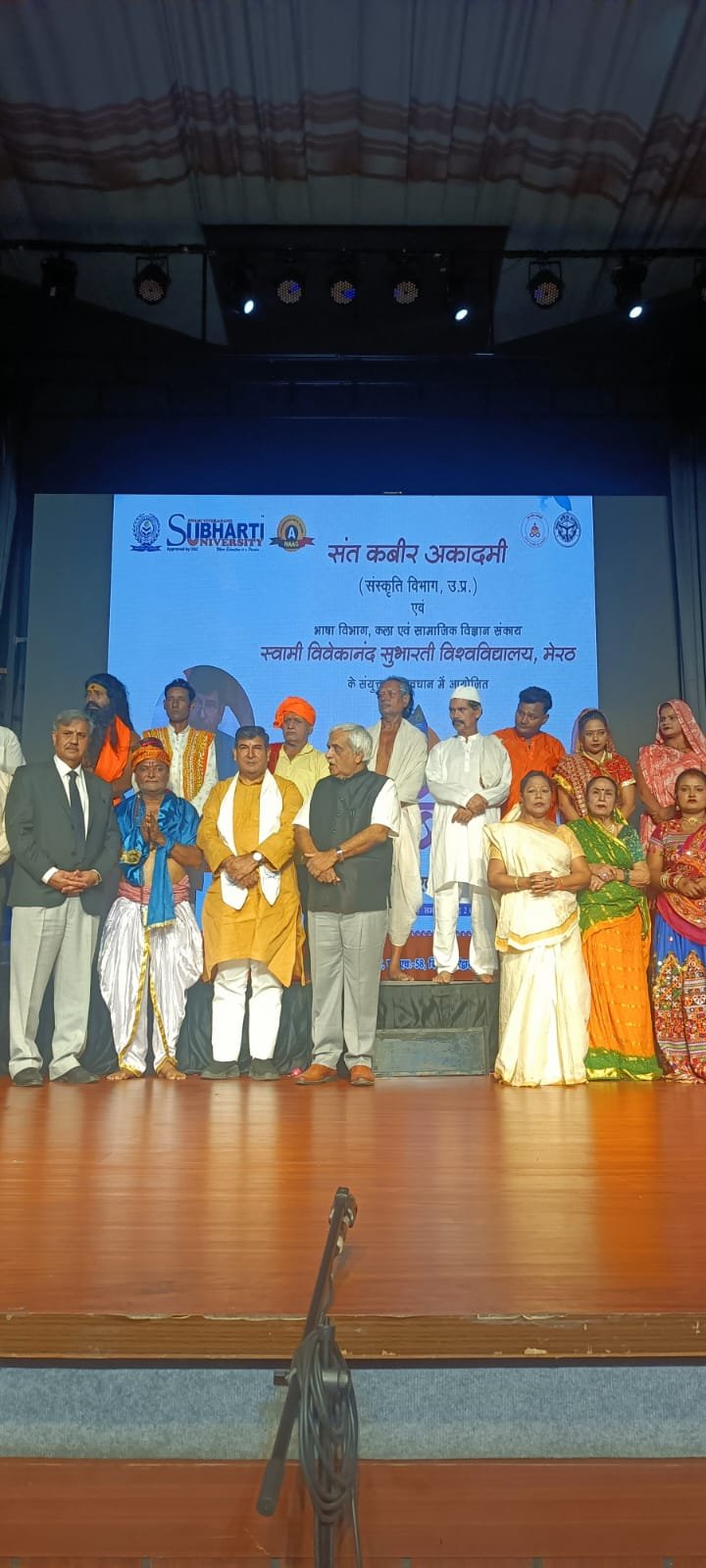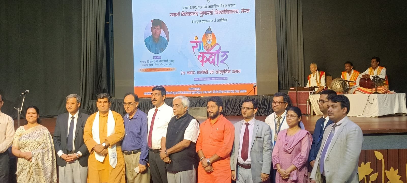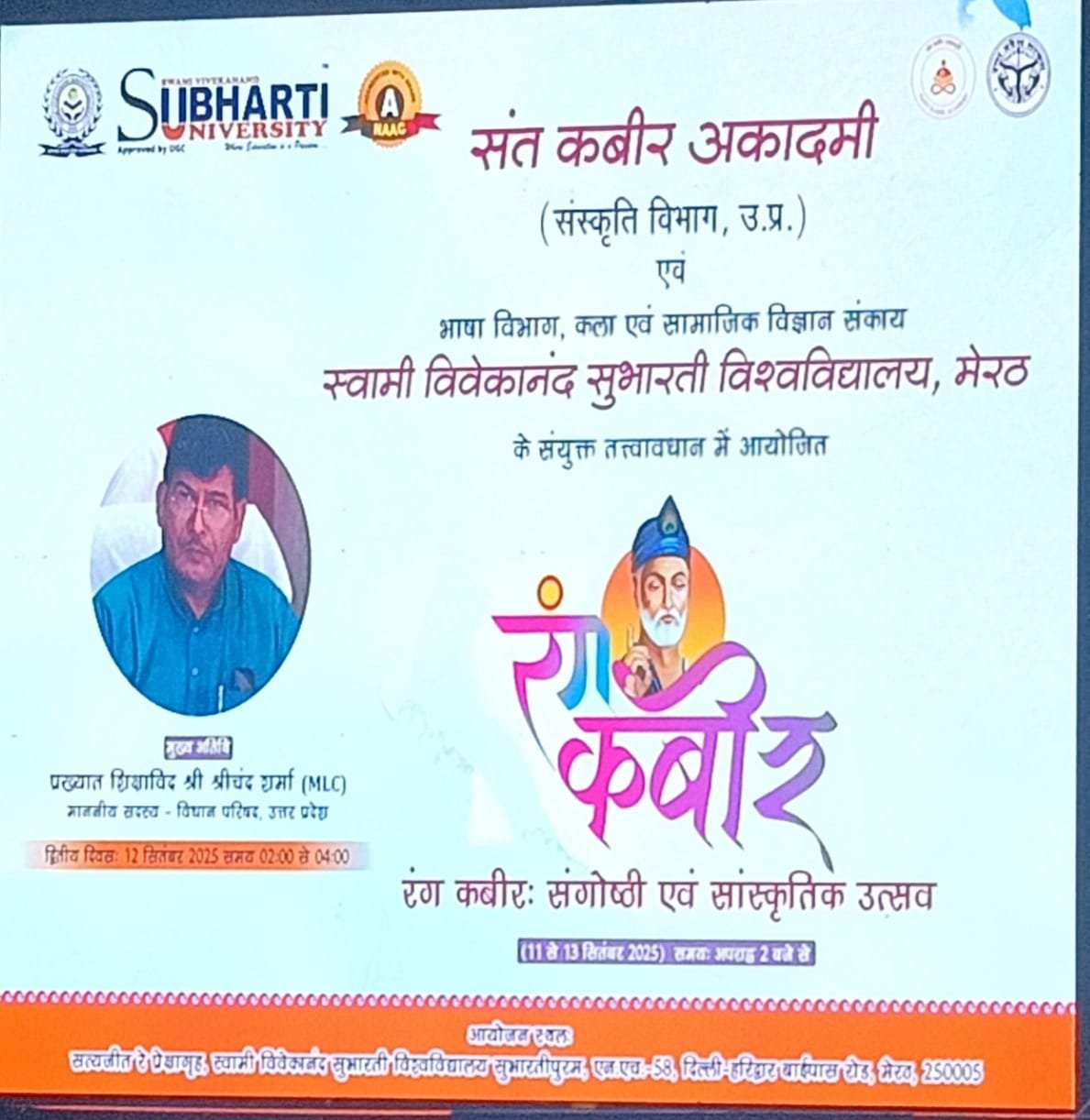 संत कबीर अकादमी (संस्कृति विभाग, उत्तर प्रदेश) एवं स्वामी विवेकानंद सुभारती विश्वविद्यालय, मेरठ के संयुक्त तत्वावधान में आज से तीन दिवसीय “रंग कबीर: संगोष्ठी एवं सांस्कृतिक उत्सव” का शुभारंभ हुआ। यह आयोजन 11 से 13 सितम्बर 2025 तक स्वामी विवेकानंद सुभारती विश्विद्यालय, सुभारतीपुरम, मेरठ में आयोजित किया जा रहा है।इस अवसर पर माननीय श्री श्रीचन्द शर्मा M L C, माननीय सदस्य विधान परिषद उत्तर प्रदेश की गरिमामयी उपस्थिति रही।